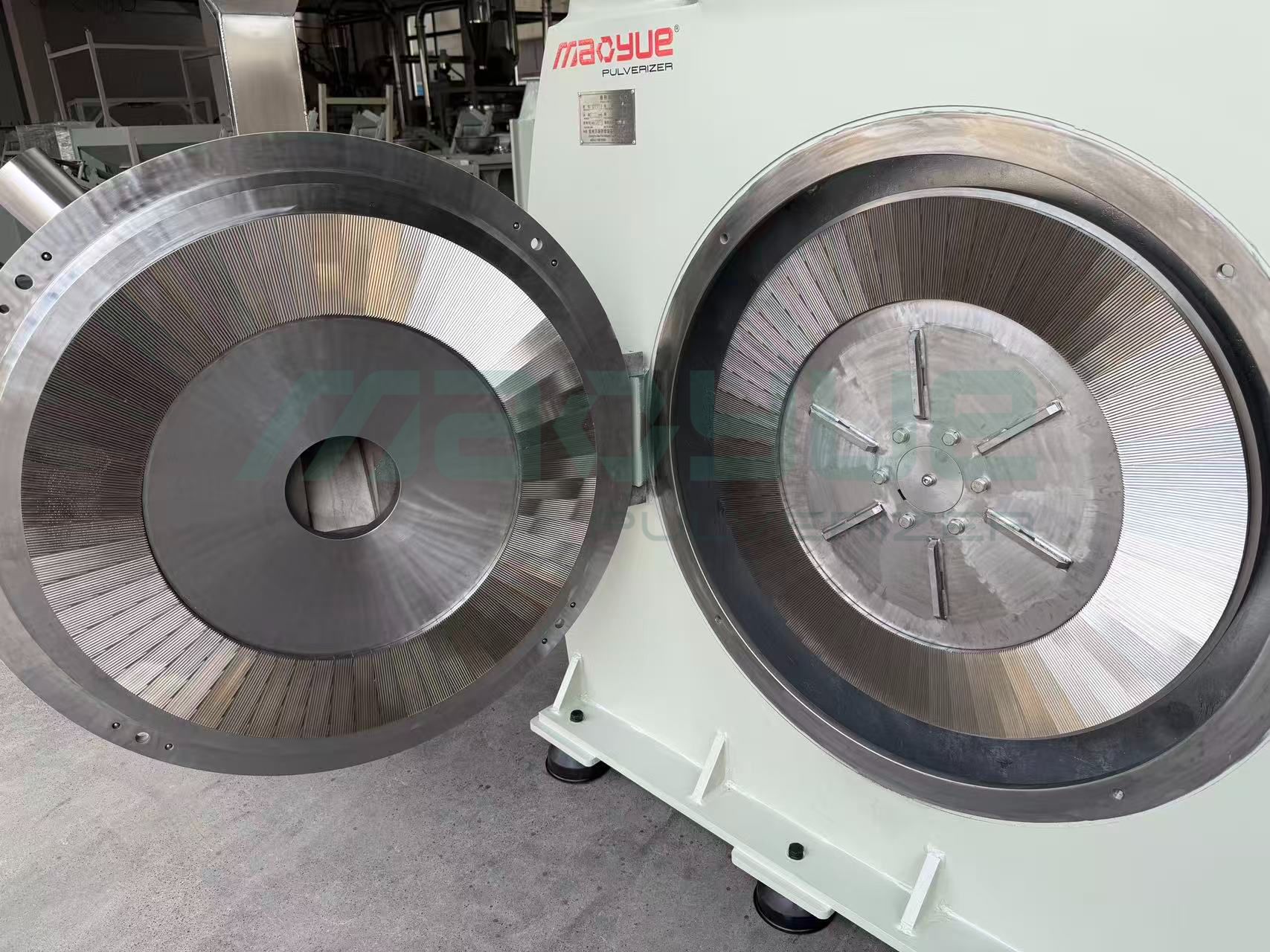 Maoyue PE mill is designed to customize the best quality plastic mill for customers, while ensuring the output, we can grind the particles down to 0.15mm. The feeding method can either be vertical feeding to prevent the material from clogging the machine, or vacuum suction to improve the feeding speed of small particles. The coarseness of the finished powder is realized by adjusting the distance between the grinding discs, and we use DC53 material with extremely high hardness. As the size of the split grinding block can be selected, the PE mill can grind many materials, including PE, PP, LDPE, HDPE, EVA, PET, NBR and so on.